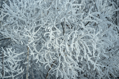 Frozen tree branches covered with white snow. Beautiful winter wonders of nature. Winter background