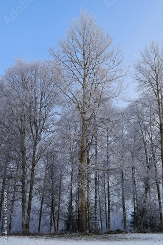 Frozen tree branshes and needless in sunny cold weather morning time rural countryside in Kongsvinger, Norway
