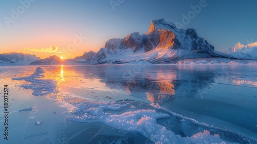 frozen tundra at sunrise, with the ground covered in shimmering ice and snow
