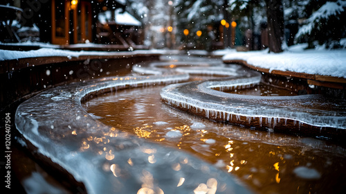 winter, snow, ice, glacé, water, feature, stream, river, grooved, curve, path, cold, frost, landscape, nature, scenic, background, texture, design, detail, element, season, holiday, light, night, dark, wood, brown, surface, flowing, pathway, crystal, icy, winter landscape, snowfall, serpentine, meandering, ambient, illuminated, atmosphere, magical, calm, peaceful, stillness