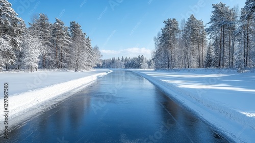 Frozen waterway cuts through snowy forest under clear blue sky a serene winter landscape of natural seasonal beauty and cold climate