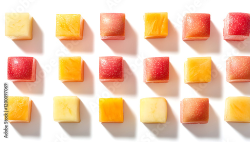 food, candy, sweet, isolated, dessert, jelly, fruit, sugar, white, red, yellow, colourful, orange, green, snack, cake, sweet, tasty, cube, closeup, delicious, pink, colours, bright, nobody