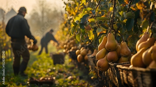 Fruit farmers harvest autumn pear trees for a bountiful harvest