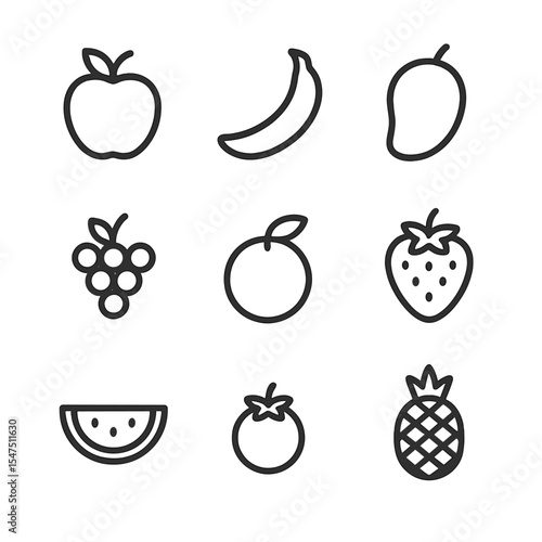 fruit, icon, grid, outline, set, crop, apple, banana, mango, grape, orange, strawberry, watermelon, blueberry, pineapple, line, icon, only, black, colours, consistent, stroke, weight, across, all, set