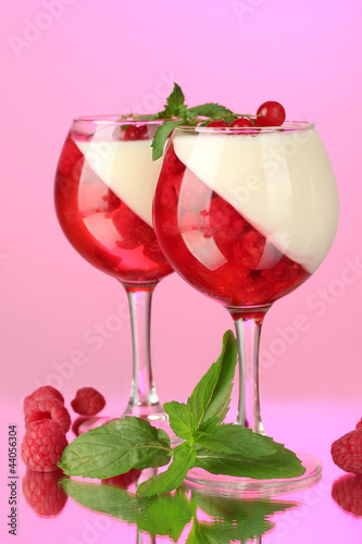fruit jelly with berries in glasses on pink background