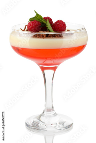 fruit jelly with chocolate and raspberries in glass isolated