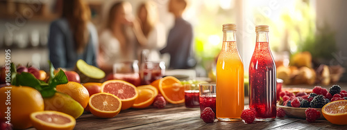 glasses, bottle, orange, juice, grapefruit, mixed, berry, rustic, table, summer, afternoon, relaxed, smile, fresh, fruit, natural, drink, generative, ai, food, honey, jar, sweet, healthy, white, yellow, isolated, dessert, organic, ingredient, closeup, bottle, tasty, green, nourishment, liquid, spoon