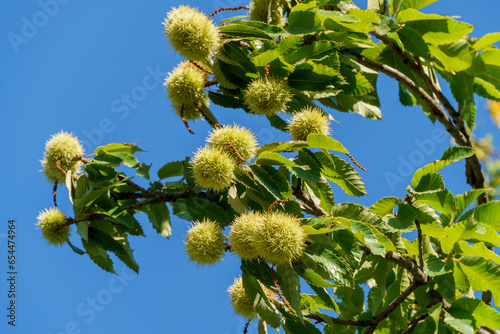Fruits of sweet chestnut tree (Castanea sativa). Close-up of Sweet Chestnut (Spanish or just chestnut) fruits on blue sky background in public landscape city park Krasnodar or Galitsky Park.