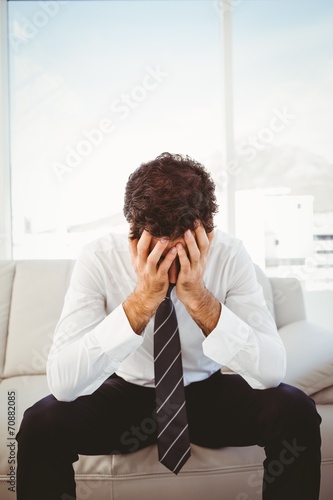 young adult, man, male, middle eastern, businessman, suit, well-dressed, smart, elegant, posh, stylish, sophisticated, attaching, jacket, serious, stern, unsmiling, frowning, sitting, couch, sofa, suffering, painful, grieved, disease, sufferance, bruised, misery, distress, indoor, looking down