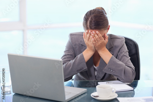 attractive, beautiful, beauty, beverage, business, businesswoman, career, chief, hot drink, communication, computer, contemporary, corporate, cup, desk, drink, laptop, looking, modern, notebook, office, pen, pretty, professional, secretary, sitting, staff, tea, technology, men at work, workplace, stress, ache, pain, painful, stressful, hand, gesture, sleepy, covering, eye
