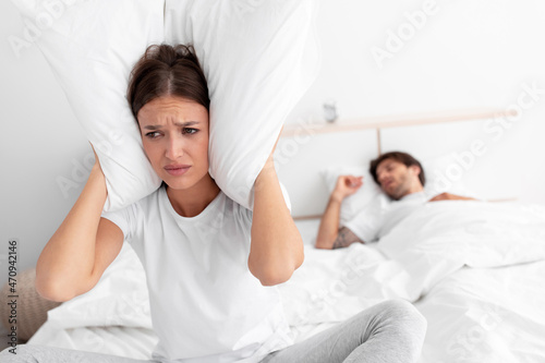 frustration, offended, caucasian, wife, sit, bed, covering, ear, pillow, suffering, snoring, husband, rest, white, bedchamber, interior, apnea, noise, sleep, problem, empty space, unhappy, angry, young, female, sleepy, woman, night, indoor, insomnia, bad, annoyed, stressed, lady, couple, family, love, human relationships, partner, spouse, married, european, home, problem, awake, health, negative, people
