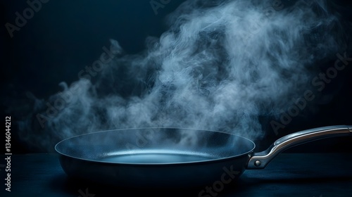 frying pan, smoke, steam, cooking, kitchen, hot, dark, food, heat, vapour, meal, dinner, preparation, culinary, chef, eatery, cookery, cook, pan, utensil, appliance, aroma, delicious, smell, favor, temperature, blue, background, indoor, nobody, still life, copy space, equipment