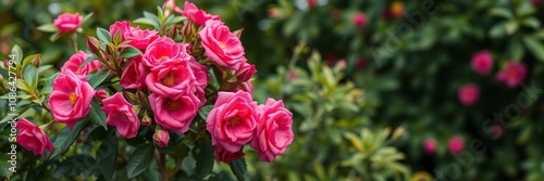 fuchsia bush roses in a lush green setting, garden design, floral arrangement, blooming flowers