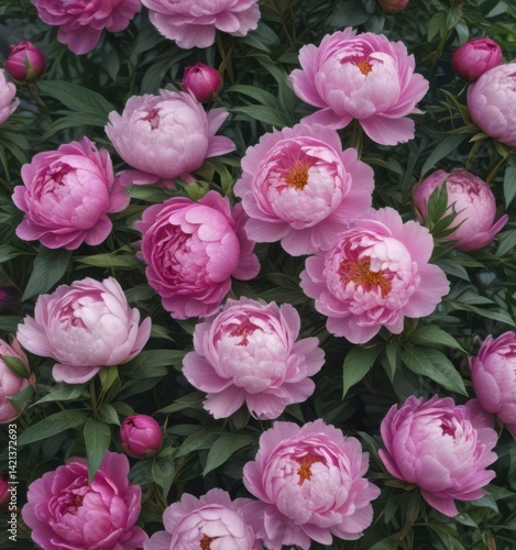 Full bloom peonies, vibrant color, lush foliage , green, botanical