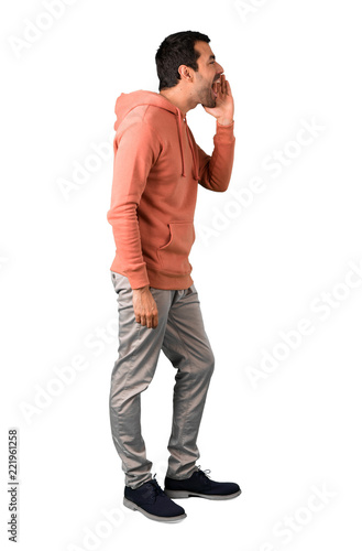 Full body of Man in a pink sweatshirt shouting with mouth wide open and announcing something on isolated white background
