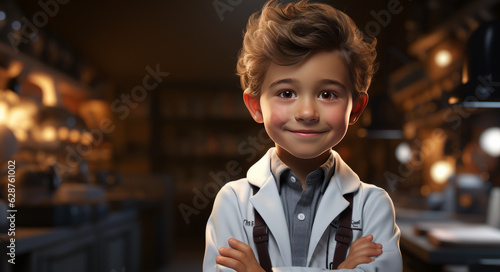 full body portrait, cute hyperrealistic boy, arms crossed, wearing doctor clothes, bright background, studio lighting.generative ai