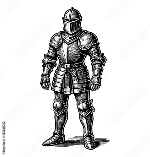 full, body, portrait, mediaeval, armored, knight, standing, tall, attention, armoring, helmet, warrior, protection, steel, weapon, metal, soldier, history, uniform, battle, combat, historical, defense, fight, strong, fighter, guard, ancient, power, military, shield, iron, brave, person, black, white, figure, renaissance, culture, fantasy, powerful, bravery