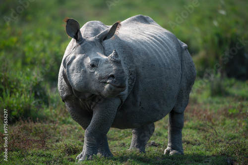 Full body portrait of greater one-horned rhinoceros standing in a short grass meadow at Kaziranga National Park, Assam, India