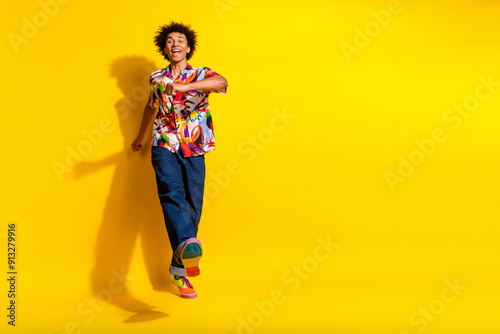 Full body portrait of nice funky young man walk dance empty space wear shirt isolated on vibrant yellow color background
