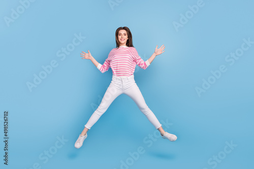 Full body portrait of satisfied cheerful person enjoy free time jumping isolated on blue color background