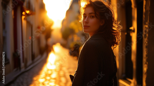 Full body shot, a French woman, Photography, French Streets background, backlighting, rim light