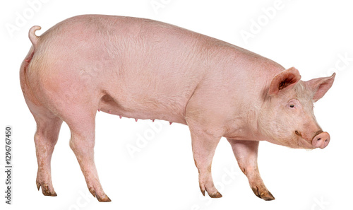 pig, farm animal, agriculture, farming, animal, mammal, pork meat, meat, food, isolated, standing, full body, farm animal, pink, white, food industry, animal husbandry, cut-out, transparent, studio shot, profile, half face, no people, copy space, clean, healthy, commercial