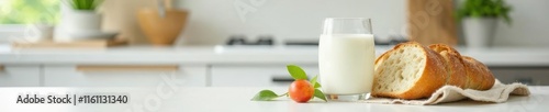 Full glass of fresh milk, homemade bread on white countertop, white, smooth, texture
