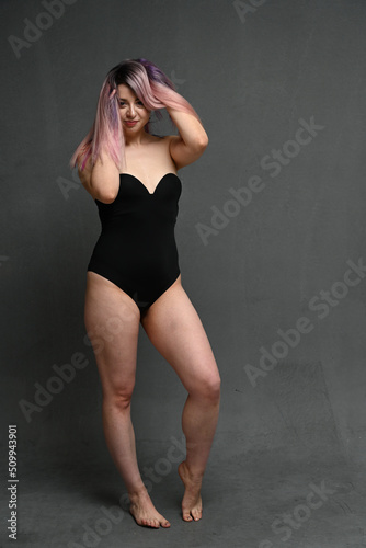 Full length adult woman in a black bodysuit holding her hair with a smile