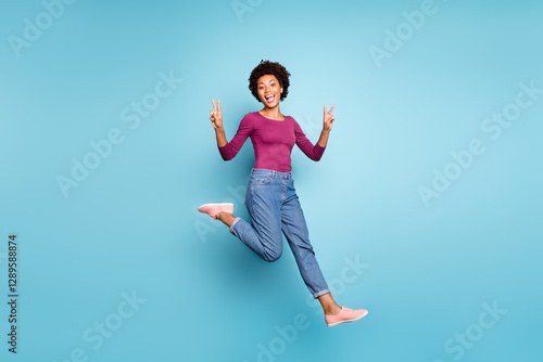 Full length body size photo of cheerful funny screaming friendly nice dark skinned woman jumping jeans denim green sweater showing you v-sign isolated over vivid color blue background running