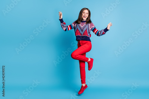 Full length body size view of attractive cheerful girl wear cozy clothes jumping having fun isolated over bright blue color background