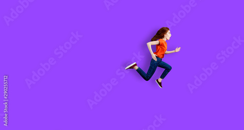 ginger, happy, jumping, woman, attractive, beautiful, beauty, casual attire, caucasian, charming, cute, female, full-length, girl, hurry, isolated, looking, lovely, 1, person, pretty, redhead, run, running, speed, studio, teenage, trendy, vertical, purple background, young, youth