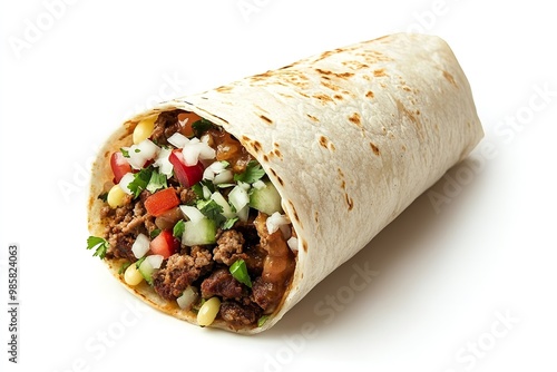 Full length, isolated side shot of a burrito on a white background. Generative Ai