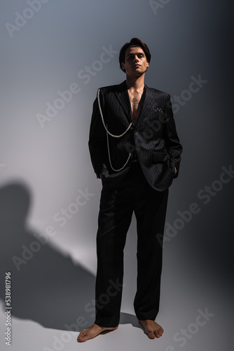full length of barefoot man in trendy suit with pearls posing with hands in pockets on dark grey