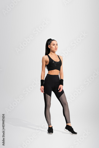 sport, beautiful, caucasian, brunette, black, grey, woman, racked, grey, sportive, fit, fitness, exercise, attractive, athletic, physical exercise, activewear, sportswoman, leggings, copy space, one person, studio shot, young adult, full-length, crop top