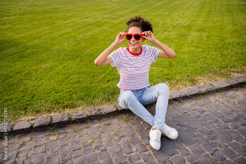 Full length photo of young cheerful african woman happy positive smile hand touch eyeglasses outdoors