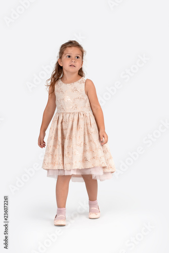 Full length portrait of a little smiling girl wearing beautiful beige elegant dress on a white background in the studio.