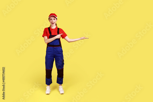 Full length portrait of amazed worker woman presenting copy space for advertisement on palm, looks at camera with excitement, wears overalls and cap. Indoor studio shot isolated on yellow background