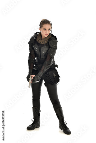 full length portrait of female soldier wearing black tactical armour, holding a gun, isolated on white studio background.