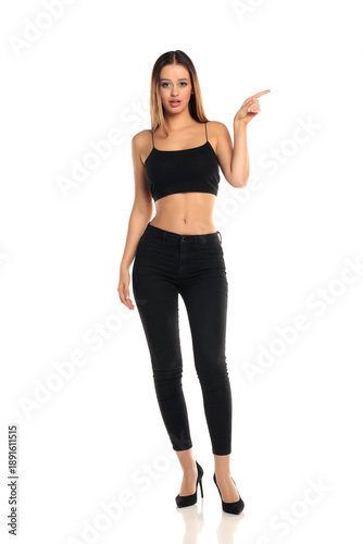 Full length studio shot of a tall brunette woman with long hair wearing a black crop top, skinny jeans and high heels pointing sideways as if indicating direction or text on a white background