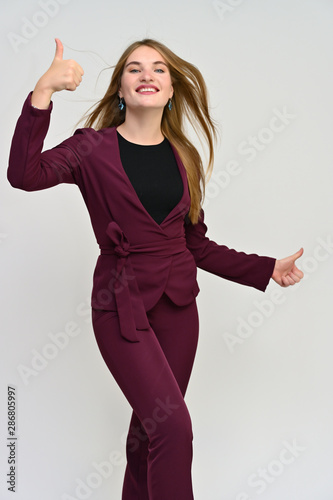 Full length vertical portrait of a pretty secretary manager brunette girl with long flowing hair in a burgundy business suit on a white background. Smiling, showing emotions.