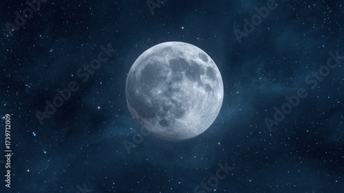 Full moon glowing brightly in a clear night sky with detailed lunar surface textures and subtle atmospheric haze over a dark natural landscape