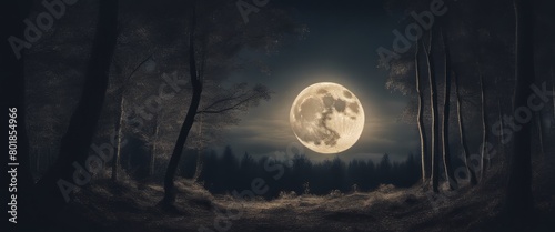 full moon in dark woods at night, fantasy forest panorama
