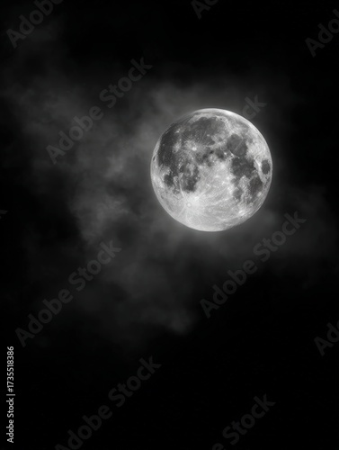 Full Moon in Night Sky Surrounded by Dark Clouds Creating Mystical and Elegant Atmosphere in Black and White Photography