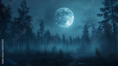 moon, night, forest, tree, pine, fog, mist, dark, blue, sky, nature, landscape, mystical, magical, skittish, mysterious, serene, tranquil, calm, cold, winter, shadow, light, wood, timberland, wilderness, atmospheric, environment, scenic, background, image, picture, illustration, digital, art, beauty, peaceful, fairy tale, fantasy, dreamlike, enchanting, silhouette, branch, conifer