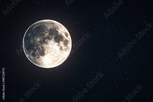 Full moon shining brightly in the night sky, surrounded by countless stars. A stunning lunar view with clear details and dark background.