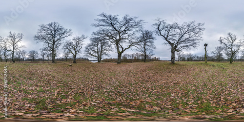 full seamless spherical hdri panorama 360 degrees angle view among oak grove with clumsy branches in forest in equirectangular projection, ready VR AR content