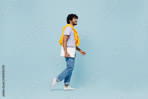 Full size body length side view exultant young bearded Indian man 20s wears white t-shirt hold use work on laptop pc computer stepping isolated on plain pastel light blue background studio portrait.