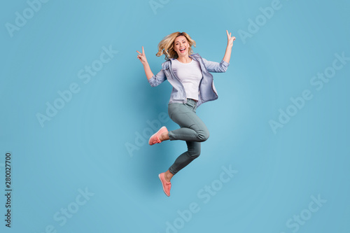 Full size photo of cheerful person jumping moving making v-signs laughing isolated over blue background