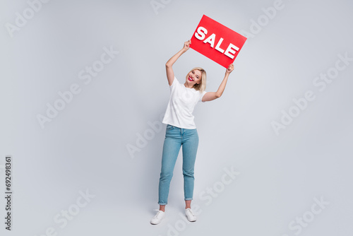Full size photo of good mood nice woman dressed white t-shirt hold placard over head announcing sale isolated on white color background