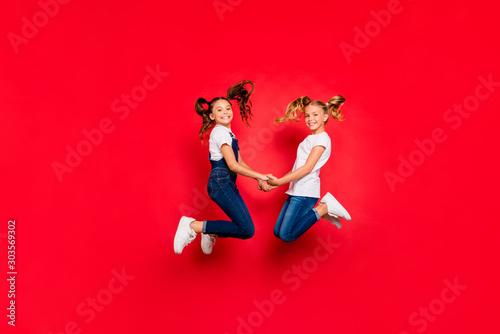 Full size profile side photo of two small people cute kids girls have x-mas holidays jump hold hands feel dream dreamy wear casual white t-shirt isolated over red color background